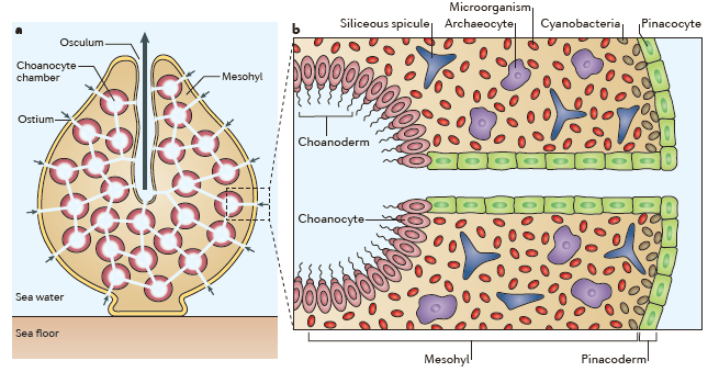 上個世紀70年代,研究人員就通過顯微鏡發現海綿體內存在豐富的微生物,在某些海綿種類里,微生物總含量可占海綿組織體積的60%?;谕诰蛐路f天然活性產物的需要以及對海綿復雜共生網絡體系本身的興趣,研究人員對海綿共生微生物群落多樣性開展了廣泛的研究。數據表明,至少有32個細菌門或暫定細菌門的微生物類群存在于海綿中。部分微生物類群僅在海綿組織中存在,推測這些類群與海綿存在緊密的共生關系,被稱作海綿特異性簇。海綿微生物群落在一定程度上也具有海綿宿主物種專一性。近來研究人員也對深海海綿開展了一些研究,數據表明深海海綿擁有一些區別于近岸海綿的特異性的微生物類群。