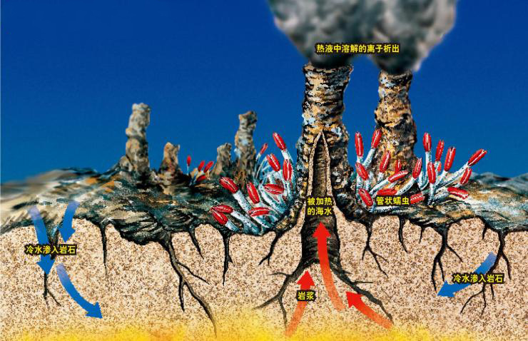 海底熱液活動在離散板塊邊界和匯聚板塊邊界均可出現,但都集中在拉張性構造帶上,主要分布于洋中脊、弧后擴張中心等。其形成的機理是:海水沿裂谷張性斷裂或裂隙滲入洋殼內部,受熾熱的熔巖影響后與基底玄武巖發(fā)生反應,形成酸性、還原且富硫化物與成礦金屬的熱液,溫度高達350~400℃。反應程度隨溫度和壓力的增加而增加,直到巖石變得難以滲透,含礦熱液就上升回到海底。當它們從噴口涌出時與冷海水相遇,導致黃鐵礦、黃銅礦、纖鋅礦、閃鋅礦等硫化物及鈣、鎂硫酸鹽的快速沉淀,最后不斷堆積成一種煙囪狀的地貌。煙囪高低粗細各不相同,高的可以達到一百多米,矮的也有幾米到幾十米。因溫度和組分差異,形成白煙囪或黑煙囪:當熱液溫度為100~350℃時,形成主要由硫酸鹽礦物(硬石膏、重晶石)、二氧化硅和白鐵礦組成的白煙囪。當溫度≥350℃時,形成由暗色硫化物如磁黃鐵礦、閃鋅礦和黃銅礦等堆積而成的黑煙囪。