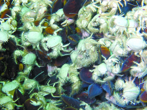 熱液生態(tài)系統(tǒng)與陸地-淺海光合作用為基礎的生命體系有根本區(qū)別,它們形成以嗜熱硫還原細菌為基礎生產力的食物鏈,構成一個自養(yǎng)自給的共生系統(tǒng),目前認為海底熱液是其營養(yǎng)物質的初始來源。這一環(huán)境內的生物組成主要有細菌、雙殼類、鎧甲蝦,與細菌共生的巨型管棲動物、管水母、腹足類和一些魚類,這在壓力巨大、一片漆黑的海底形成了一片繁華的生命奇景。這一群落隨著“熱液”的長消而出沒,當“熱液”停止噴發(fā),這一群落也隨著消失。當新的“熱液”產生時,又能形成新的群落。