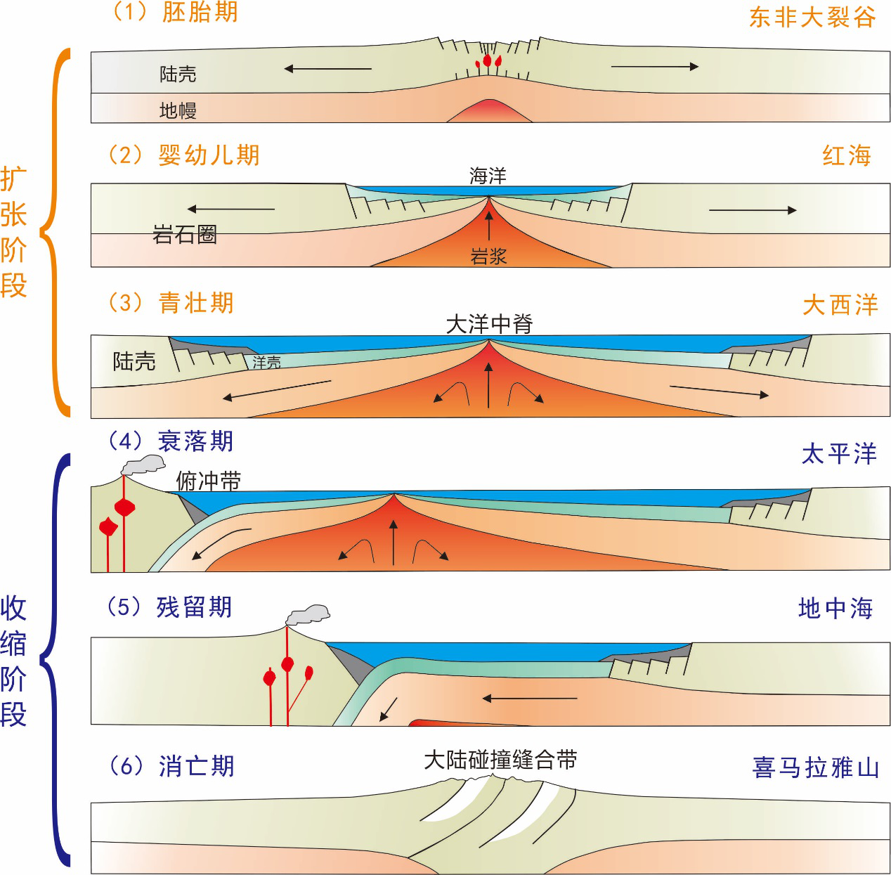 從板塊構造觀點來看,洋殼盆地并非永恒存在,一般都經歷開裂、擴張、收縮、閉合的發展過程。大陸巖石圈在水平方向上彼此分離與拼合運動的一次全過程被稱為威爾遜旋回。1974年由J.F.杜威和K.C.A.伯克提出。為紀念加拿大地質學家J.T.威爾遜而命名。威爾遜旋回的起始和終結用胚胎期→嬰幼兒期→青壯期→衰落期→殘留期→消亡期來表達,相對應的實例為東非裂谷→紅海亞丁灣→大西洋→太平洋→地中海→喜馬拉雅山。