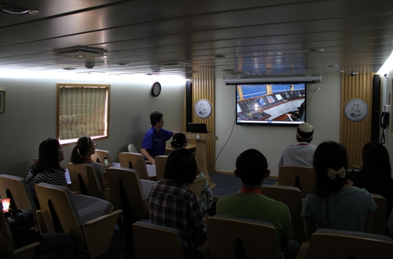 “科學”號船長隋以勇詳細介紹了“科學”號的船舶設計、建造過程以及各項參數性能。考察團一行參觀了駕駛室、綜合儀器室、實驗室、機艙、絞車艙、作業甲板等工作場所,以及住房、餐廳、休閑、健身等生活場所,對船舶動力定位、減搖水艙功能和綜合科學考察能力進行了詳細了解。