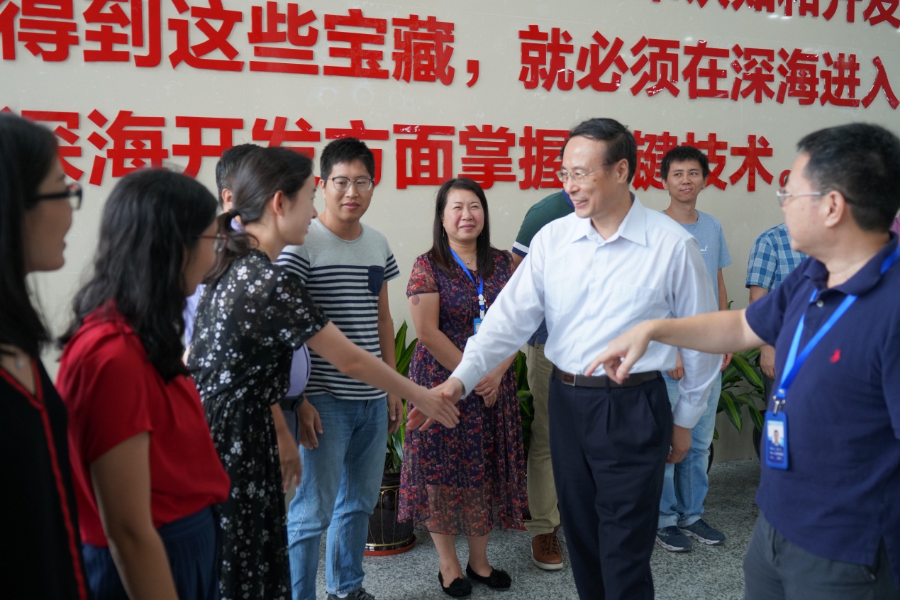 萬立駿一行實地查看了各型深海科考裝備,了解研究所概況和未來發(fā)展方向,并觀看海試宣傳片。隨后,在綜合樓大廳接見了該所歸國留學人員代表。