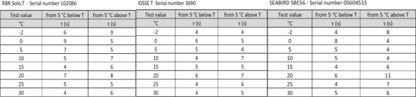 20186月開始,Trescal機構選取了海鳥(SBE 56)RBR (Solo.T)、NKE(S2T)、NKE(WiSens)等國際上知名海洋傳感器制造商供應的同類溫度傳感器,進行比測試驗,在長達24周的測試期內,分別完成了測量精度、響應時間等一系列性能測試。測試結果顯示:RBR Solo.TIDSSE TSBE 56的測量誤差均不超過±0.020℃,其中RBR Solo.T的最大誤差為-0.006℃IDSSE T的最大誤差為0.016℃SBE 56的最大誤差為0.020℃;在響應時間測試中,RBR Solo.TIDSSE TSBE 56的系統整機響應時間均維持在11s以內,測試結果比對圖如下: