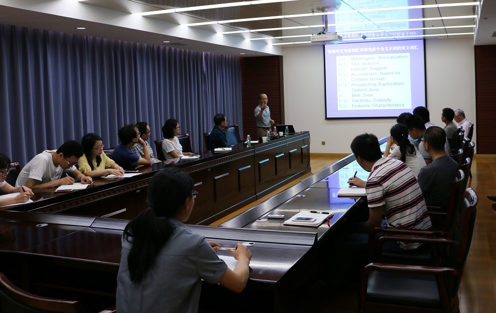 報告中,池國祥教授系統地從結構及格式問題、語法和用詞問題、投稿注意事項等幾個方面分步介紹了英文地質論文寫作中應該注意和避免的錯誤。薛春紀教授向大家展示了與池國祥教授合作研究的金頂鉛鋅礦樣品的巖相學和礦相學顯微照片,其礦石的“菌斑”結構十分明顯;同時還展示了金頂鉛鋅礦中硫化物的硫同位素特征,結果表明其成礦硫源大部分從細菌還原沉積硫酸鹽而來。BSR(微生物硫酸鹽還原作用)在金頂鉛鋅礦的成礦過程中起了關鍵作用。薛教授和池教授將會與本研究組開展后續的合作研究,以進一步驗證金頂鉛鋅礦中含H2S包裹體的成因。