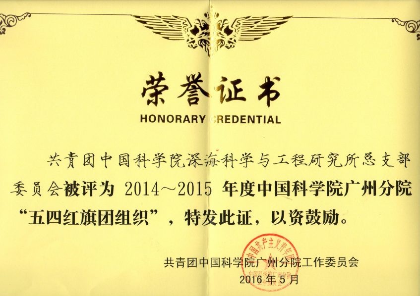 為進一步推進中國科學院廣州分院基層團組織的各項建設,增強團組織的凝聚力和戰斗力,引導團員、團干部積極投身實施 “率先行動”計劃,廣州分院團工委在“五四青年節”期間,表彰一批2014~2015年度廣州分院“五四紅旗團組織”、優秀團干部和優秀團員。深海所團總支部被評為“2014~2015年度中國科學院廣州分院五四紅旗團組織”,吳乃天同志被評為“2014~2015年度中國科學院廣州分院優秀共青團干部”。