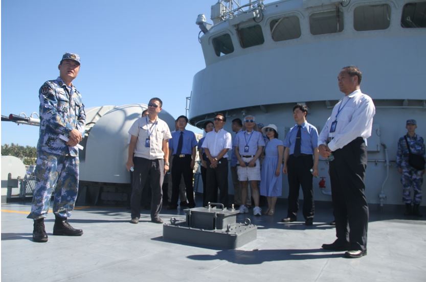 七月的三亞,滿目蒼翠,碧海藍天,軍港內(nèi)一艘艘戰(zhàn)艦在碧波青山前顯得尤為雄偉壯觀。此次教育活動參觀的戰(zhàn)艦為綿陽艦。據(jù)介紹,綿陽艦是中國自行設計建造的新型導彈護衛(wèi)艦,該艦曾赴亞丁灣、索馬里海域執(zhí)行護航任務。在官兵的帶領下,大家先后參觀了反艦、防空、反潛等各式武器裝備,了解各類武器性能,近距離觀察體會了近年來海軍建設發(fā)展取得的輝煌成就。