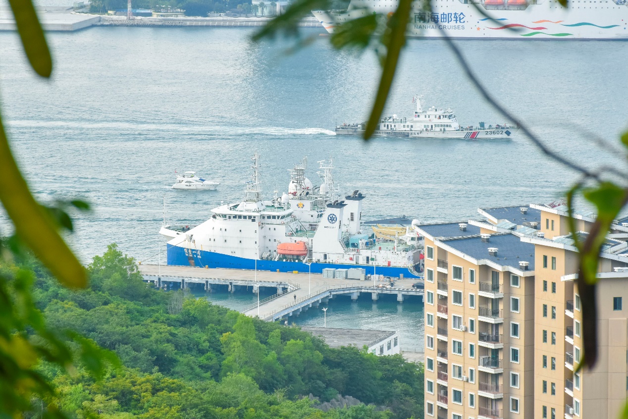 從山頂俯瞰停靠在救撈局碼頭的“探索一號”科考船