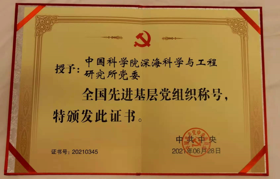 在建黨100周年之際,獲得黨中央頒發的全國先進基層黨組織的榮譽稱號,使深海所全體黨員倍受鼓舞,也更加感到使命光榮,責任重大。當前,我國進入新發展階段,正向第二個百年奮斗目標進軍,深海所黨委將帶領全所黨員和職工更加緊密地團結在以習近平同志為核心的黨中央周圍,牢記初心使命,堅定理想信念,踐行黨的宗旨,增強“四個意識”、堅定“四個自信”、做到“兩個維護”,以更加嚴謹科學的態度和自立自強的姿態,進一步弘揚“團結協作、砥礪探索、勇敢擔當、甘于奉獻”的深淵科考精神,立足三亞,挺進深海,堅守祖國南海門戶,大力推進深海科技創新,為加快建設海洋強國做出新的更大的貢獻。