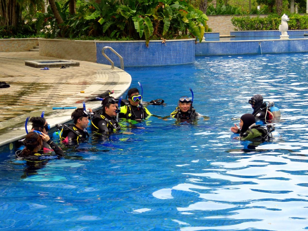 本次培訓(xùn)內(nèi)容基于SDI (Scuba Diving International)組織認(rèn)證的Open Water SCUBA Diver(開放水域水肺潛水員)課程,通過連續(xù)4天的緊湊課程,學(xué)員學(xué)習(xí)了潛水理論、水池訓(xùn)練等24項(xiàng)技巧,進(jìn)行了理論課考試、開放海域技巧練習(xí)、20米深水池考核。課程結(jié)束后,學(xué)員將收到國際認(rèn)證的開放水域潛水員證書。