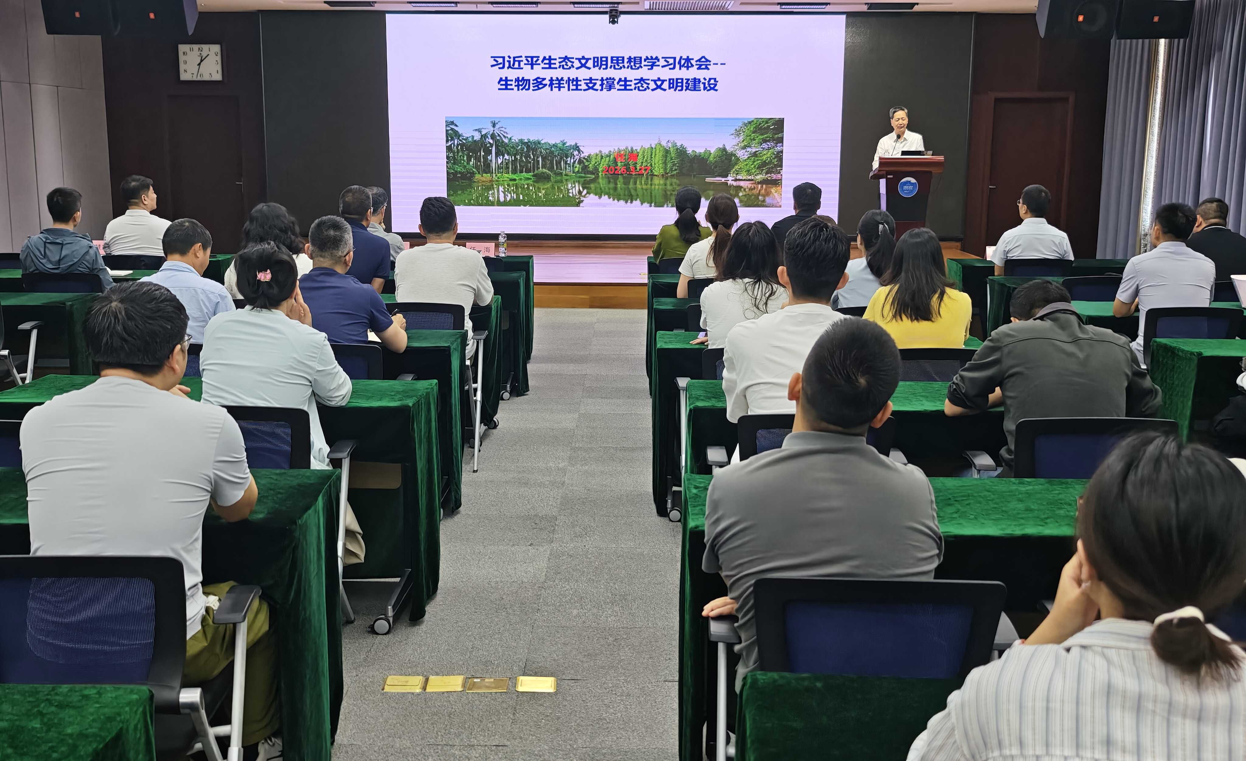 任海結合長期從事植被生態恢復研究的實踐與思考,圍繞習近平生態文明思想、生物多樣性、生態服務與生態文明、經濟植物利用與綠色發展等四個方面,系統闡述了生態文明思想的深刻內涵與時代價值,報告視野宏闊、內容豐富、見解深刻,兼具理論高度與實踐深度,現場學習氛圍濃厚。