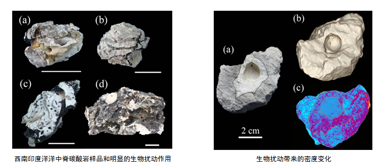 生物擾動作用是海洋沉積物中的常見現(xiàn)象,能夠促進沉積物和間隙水之間的物質(zhì)交換,是沉積物地球化學元素重新分布的營力之一。為探索生物擾動作用和深海碳酸巖成巖作用之間的關(guān)系,中科院深海科學與工程研究所彭曉彤研究員團隊對采集自西南印度洋洋中脊的深海碳酸巖進行了X射線斷層掃描、電子顯微鏡以及元素同位素地球化學研究。結(jié)果表明,該碳酸巖成巖過程伴隨的生物擾動作用促進了深海碳酸鹽礦物的溶解和重結(jié)晶過程,驅(qū)動了深海碳酸巖成巖作用的發(fā)生。以上認識不僅有助于拓展對深海碳酸巖成巖作用的理解,也加深了對深海底棲生物活動和地質(zhì)過程互相作用的認識。
