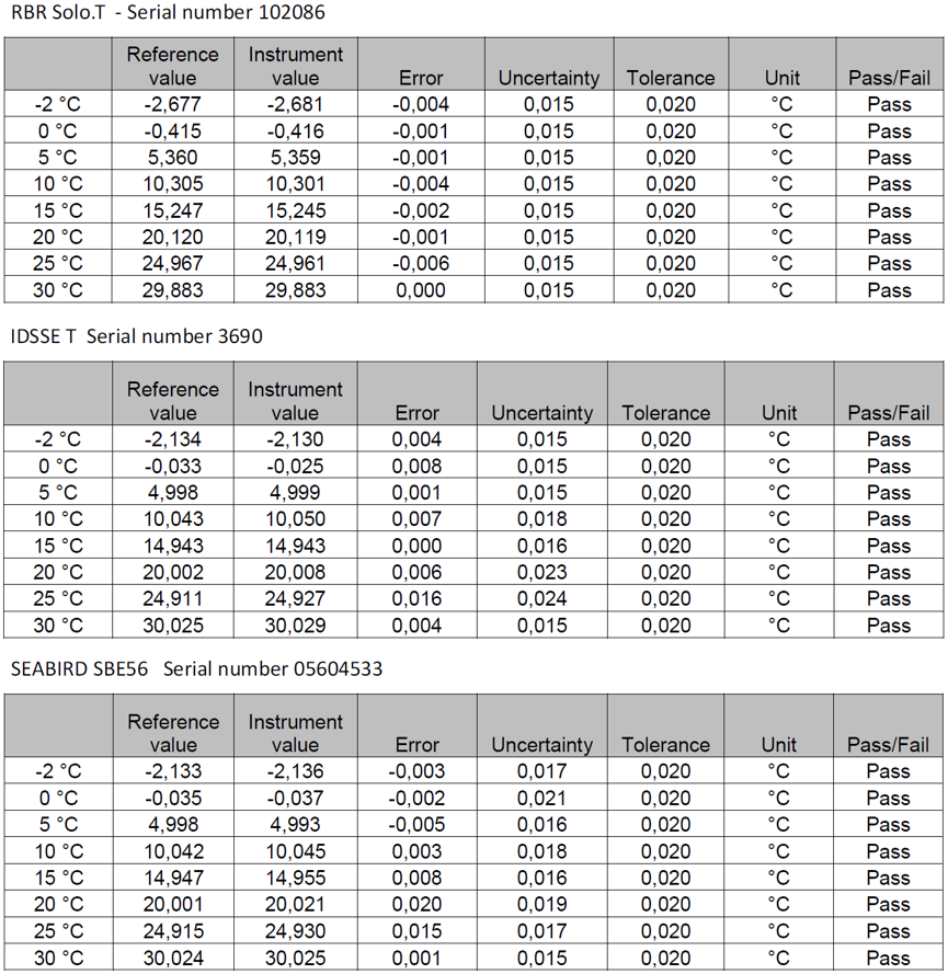 自2018年6月開始,Trescal機(jī)構(gòu)選取了海鳥(SBE 56)、RBR (Solo.T)、NKE(S2T)、NKE(WiSens)等國際上知名海洋傳感器制造商供應(yīng)的同類溫度傳感器,進(jìn)行比測試驗(yàn),在長達(dá)24周的測試期內(nèi),分別完成了測量精度、響應(yīng)時(shí)間等一系列性能測試。測試結(jié)果顯示:RBR Solo.T、IDSSE T和SBE 56的測量誤差均不超過±0.020℃,其中RBR Solo.T的最大誤差為-0.006℃,IDSSE T的最大誤差為0.016℃,SBE 56的最大誤差為0.020℃;在響應(yīng)時(shí)間測試中,RBR Solo.T、IDSSE T和SBE 56的系統(tǒng)整機(jī)響應(yīng)時(shí)間均維持在11s以內(nèi),測試結(jié)果比對(duì)圖如下: