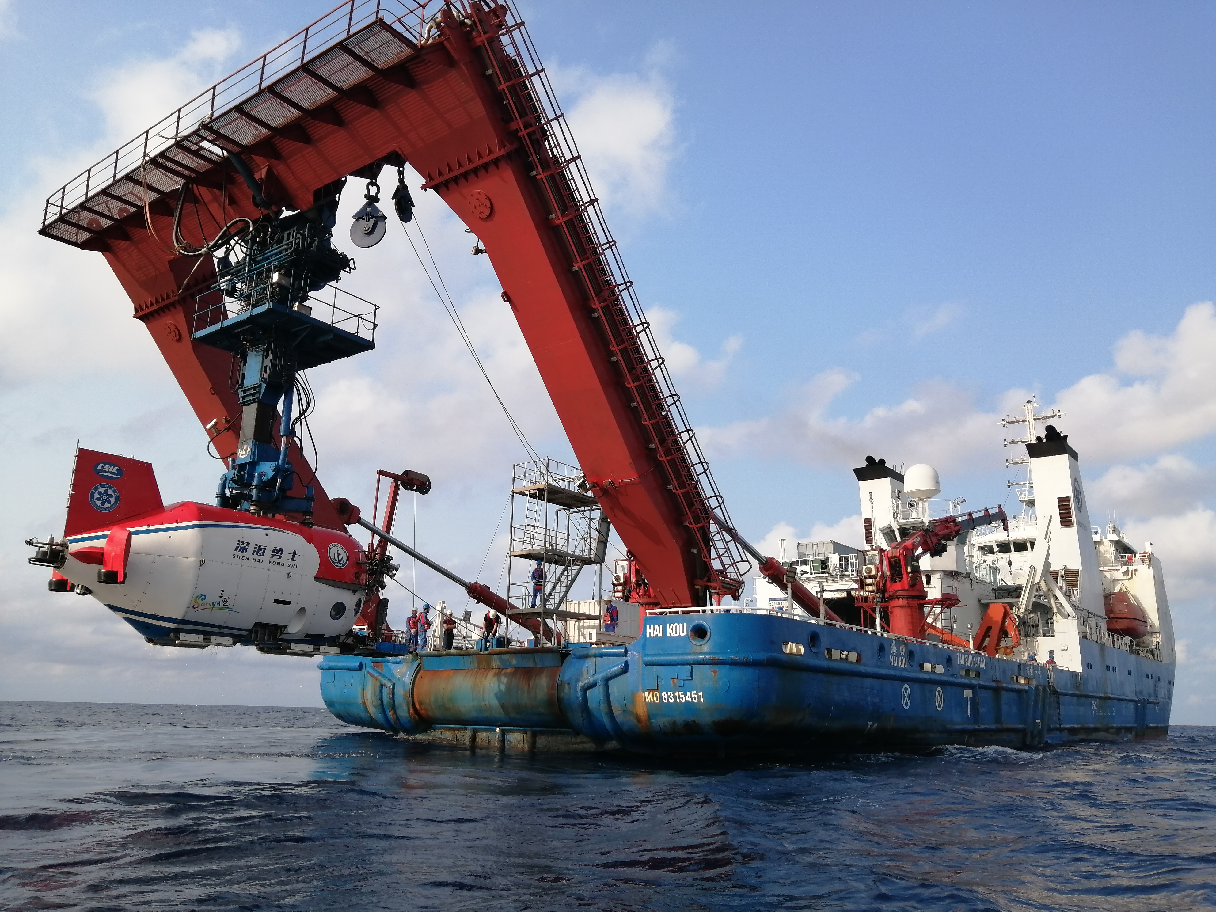 正在執行回收任務的“探索一號”船和“深海勇士”號載人潛水器