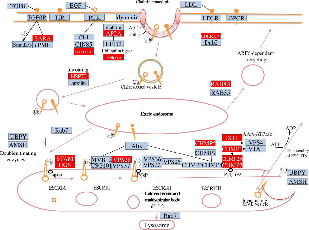 2 參與泛素化和內(nèi)吞作用的代謝通路示意圖  在高壓下顯著高表達(dá)的基因用紅色標(biāo)出