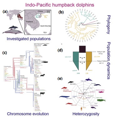 a)中華白海豚在中國南海西北部雷州灣和三娘灣的種群分布;(b)中華白海豚種群系統發育樹;c)中華白海豚染色體演化;(d)中華白海豚的種群動態;(e)雷州灣和三娘灣中華白海豚種群與其他哺乳動物雜合度的比較