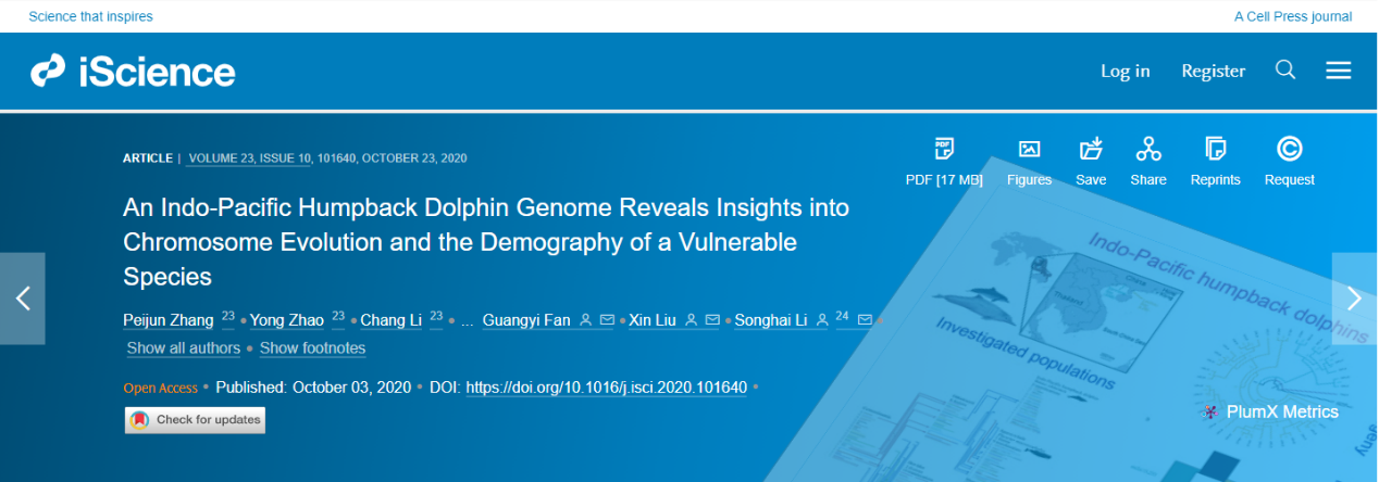 2020103日,深海所李松??蒲袌F隊與青島華大研究團隊合作,在期刊iScience (CELL子刊)在線發表了題為“An Indo-Pacific Humpback Dolphin Genome Reveals Insights into Chromosome Evolution and the Demography of a Vulnerable Species”的文章。