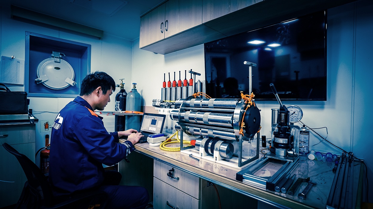 探索二號上,科研人員正在整理樣品和數據(張桅供圖)