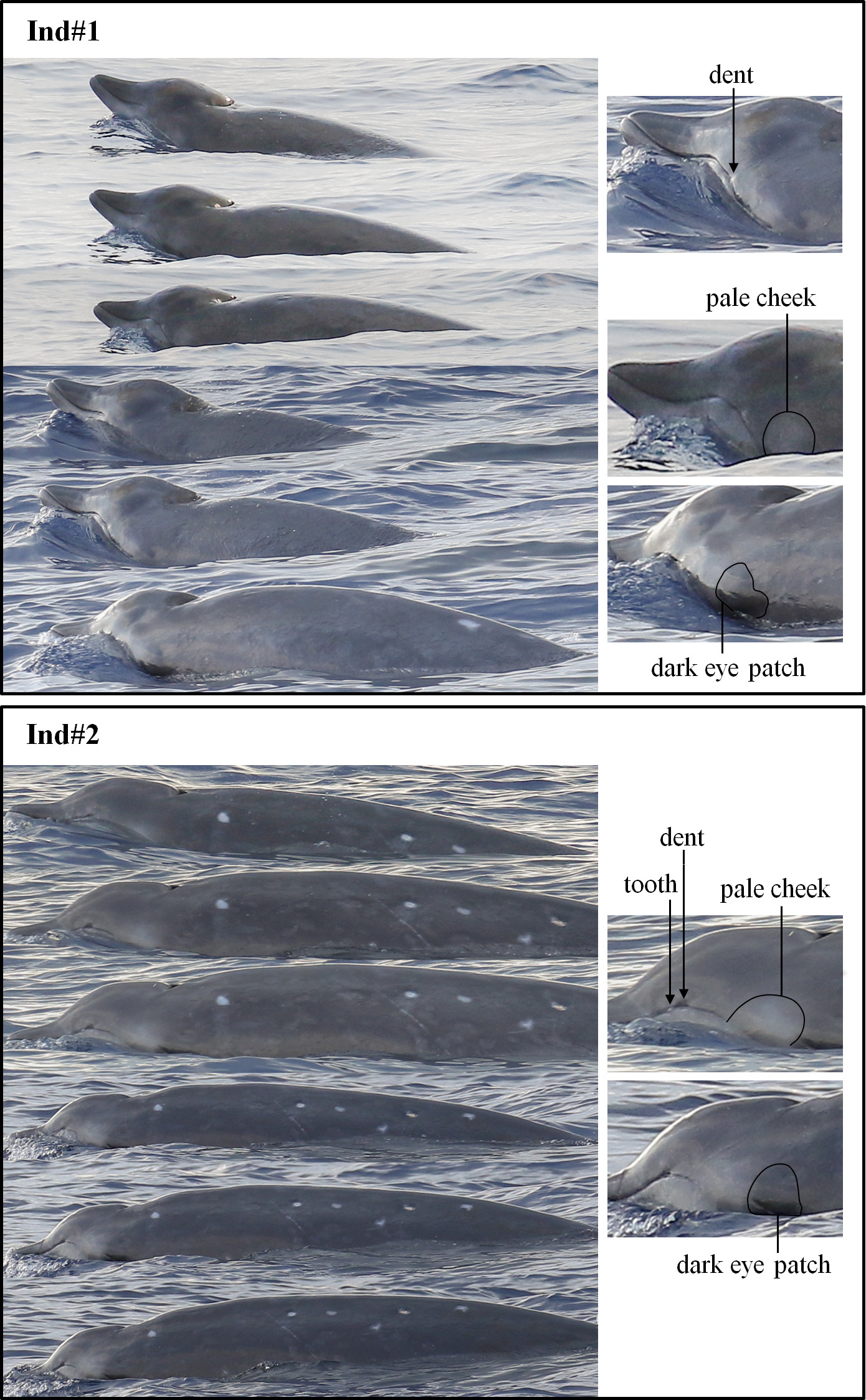 中科院深海所研究團(tuán)隊(duì)在南海目擊到的三頭喙鯨體型相似,視覺(jué)上估計(jì)體長(zhǎng)有4.5至5米。其中兩頭被拍攝到高清質(zhì)量照片,分別記為ind#1和ind#2。中等大小的鐮狀背鰭位于體長(zhǎng)約三分之二處(見(jiàn)圖1);體表背部呈灰褐色;上顎呈褐色沒(méi)有白邊;下顎和臉頰呈蒼白色;有輕微的黑眼斑;上嘴唇拱形張口后有小凹痕;ind#2有突出的牙齒(見(jiàn)圖2)。兩頭動(dòng)物體表都有達(dá)摩鯊咬痕,愈合的達(dá)摩鯊咬痕很少有白色愈合疤痕,大多數(shù)愈合疤痕與周?chē)つw的顏色相同(見(jiàn)圖3)。三頭喙鯨同步進(jìn)行了三次連續(xù)潛水(淺潛),第四次為深潛,然后消失。呼吸頻率約為每分鐘10次。此外沒(méi)有觀察到其它水面行為。