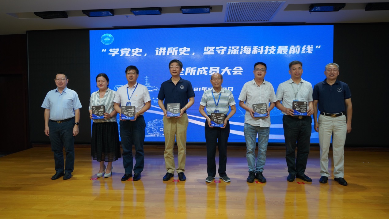 升旗儀式結(jié)束后,在學(xué)術(shù)報(bào)告廳組織召開“學(xué)黨史,講所史,堅(jiān)守深海科技最前線”成員大會(huì)。黨委委員、副所長(zhǎng)彭曉彤主持會(huì)議。會(huì)上,集中觀看深海所十周年歷程視頻,黨委副書記(主持工作)、副所長(zhǎng)陽(yáng)寧和副所長(zhǎng)許惠平為2011年入所的職工頒發(fā)了入所十周年章。隨后,原籌建組組長(zhǎng)王越超、副組長(zhǎng)戴瓊興分別回顧了深海所籌建期的故事;周義明、唐古拉山、鄧玉清、蔣磊、周皓分別結(jié)合自身工作,分享在所工作的經(jīng)歷和感受。