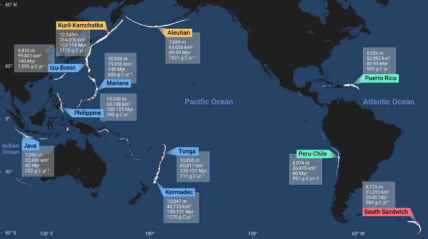 極端的深海環境孕育著地球上最神秘的生態系統。壓力大、溫度低、黑暗無光、構造活躍、地震密集、生命奇特是深淵環境的主要特征。深淵與上層海洋、海底之間存在著廣泛的物質和能量交換,是驅動地球系統演化的關鍵一環(圖3)。每個海溝的俯沖板塊年齡、形成年代、地理位置、沉積物厚度及上層水體營養狀況等方面存有差異,導致深淵地質環境的多樣性。