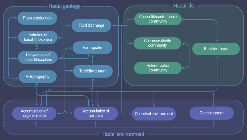 深淵地質、生命與環境之間存在著復雜的相互作用。與超基性巖蛇紋石化相關的流體活動釋放支撐了深淵底部化能自養生態系統。新的證據表明,與基性巖水合/蝕變相關的流體活動,亦可孕育深淵巖石圈內的生命,而這些生命可能在地下14公里處仍能存活,可能是地球上最深的生物圈生命形式。俯沖板塊的脫水作用可能誘發地震,進而影響深淵有機質的輸入。水合/蝕變形成的沉積物質可為深淵底部帶來大量碳、鐵等重要元素,進而影響深淵底部生物地球化學循環。