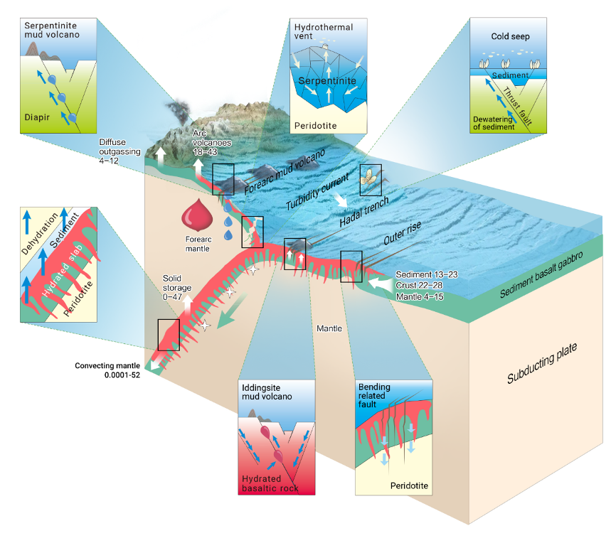 板塊俯沖是深淵區域地質過程的主要驅動力(圖4)。板塊俯沖造成板塊彎折,產生大量裂隙,巨量海水得以下滲至巖層深處。海水下滲的深度可達洋殼深處20余公里,甚至可下滲至上地幔內5-7公里,導致大規模洋殼水合作用和上地幔水合作用的發生,后者也被稱為地幔橄欖巖蛇紋石化。已發生俯沖板塊水合作用的巖石圈在繼續俯沖的過程中,會進一步發生脫水,釋放出大量流體,導致深淵區域密集的中深層地震。