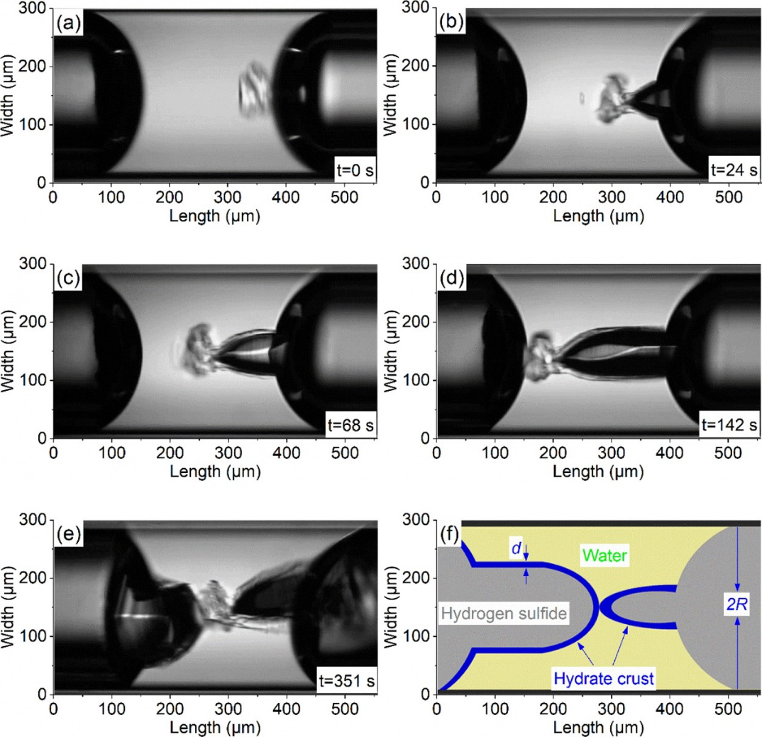 過冷度對微孔隙內水合物的形成特征有較大的影響,高過冷條件下毛細硅管中水-氣彎液面會先形成水合物光環,并向兩側生長,水合物以肉眼不可見的微晶、纖維狀和針狀晶體形態為主;中等過冷條件下水合物晶體以柱狀多面體和骨架晶體為主,水合物的轉化率要低于過冷條件;低過冷條件下水合物以塊狀多面體形態為主,包括立方體和八面體。同時,該研究首次發現微孔隙內水合物能夠以“橋接”方式連接。相關研究成果發表于ACS Omega,“Crystallization Behavior of the Hydrogen Sulfide Hydrate Formed in Microcapillaries(DOI: 10.1021/acsomega.1c01051)。文章第一作者為深海所博士研究生孫既粵,通訊作者為蔣磊研究員。