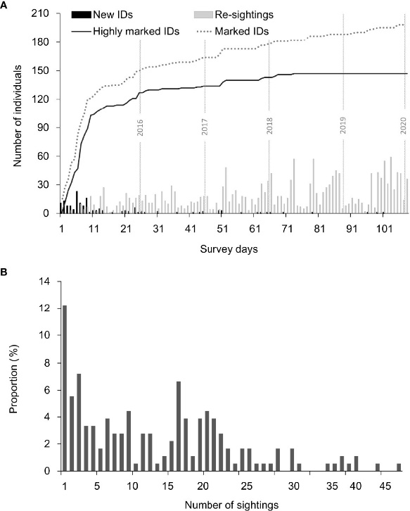 2015-2019年間,中科院深海所研究團(tuán)隊(duì)和汕頭大學(xué)研究團(tuán)隊(duì)共開展了112天實(shí)地調(diào)查,成功識(shí)別出了198頭海豚個(gè)體,包括147頭高辨識(shí)度個(gè)體(D≥3)。在合并數(shù)據(jù)集中,累積識(shí)別曲線在2017年年初達(dá)到平臺(tái)期,即已實(shí)現(xiàn)種群全覆蓋;其中123頭個(gè)體(83.7%)目擊次數(shù)超過(guò)5次,是該種群迄今為止質(zhì)量最高的個(gè)體識(shí)別數(shù)據(jù)庫(kù)。