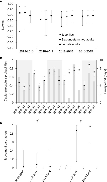 圖8.2015-2019年期間廣西三娘灣及其毗鄰海域中華白海豚(A)生存率du(B)捕獲概率和(C)運(yùn)動(dòng)參數(shù)估計(jì)