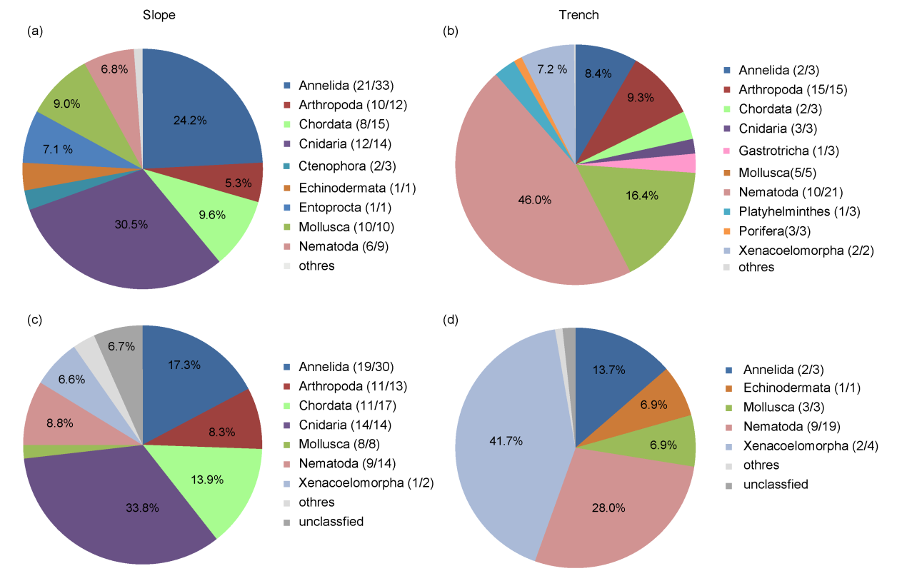 圖3 沖繩海槽和馬里亞納海溝的后生動物門類的相對豐度。其中(a)和(b)為28S rRNA基因數(shù)據(jù);(c)和(d)為18S rRNA基因數(shù)據(jù)。