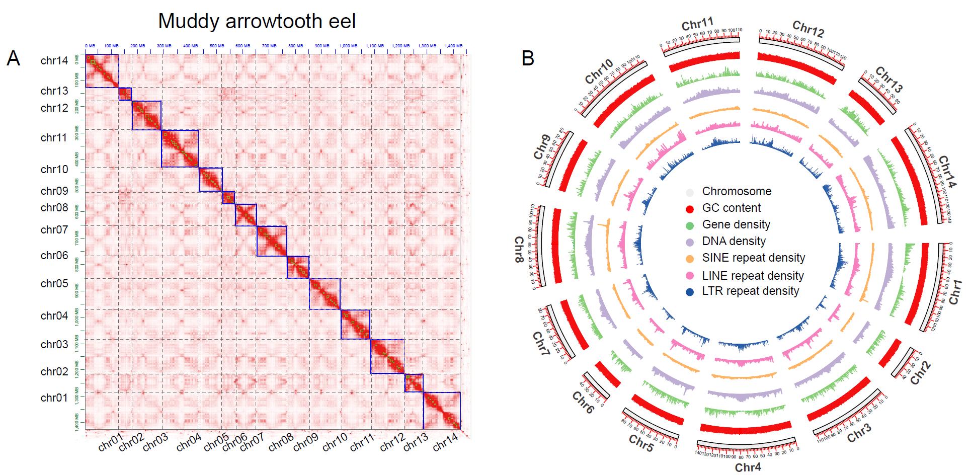 (A) 深海鰻鱺的基因組組裝及Hi-C互作熱圖 (B) 深海鰻鱺基因組組裝特征圈圖