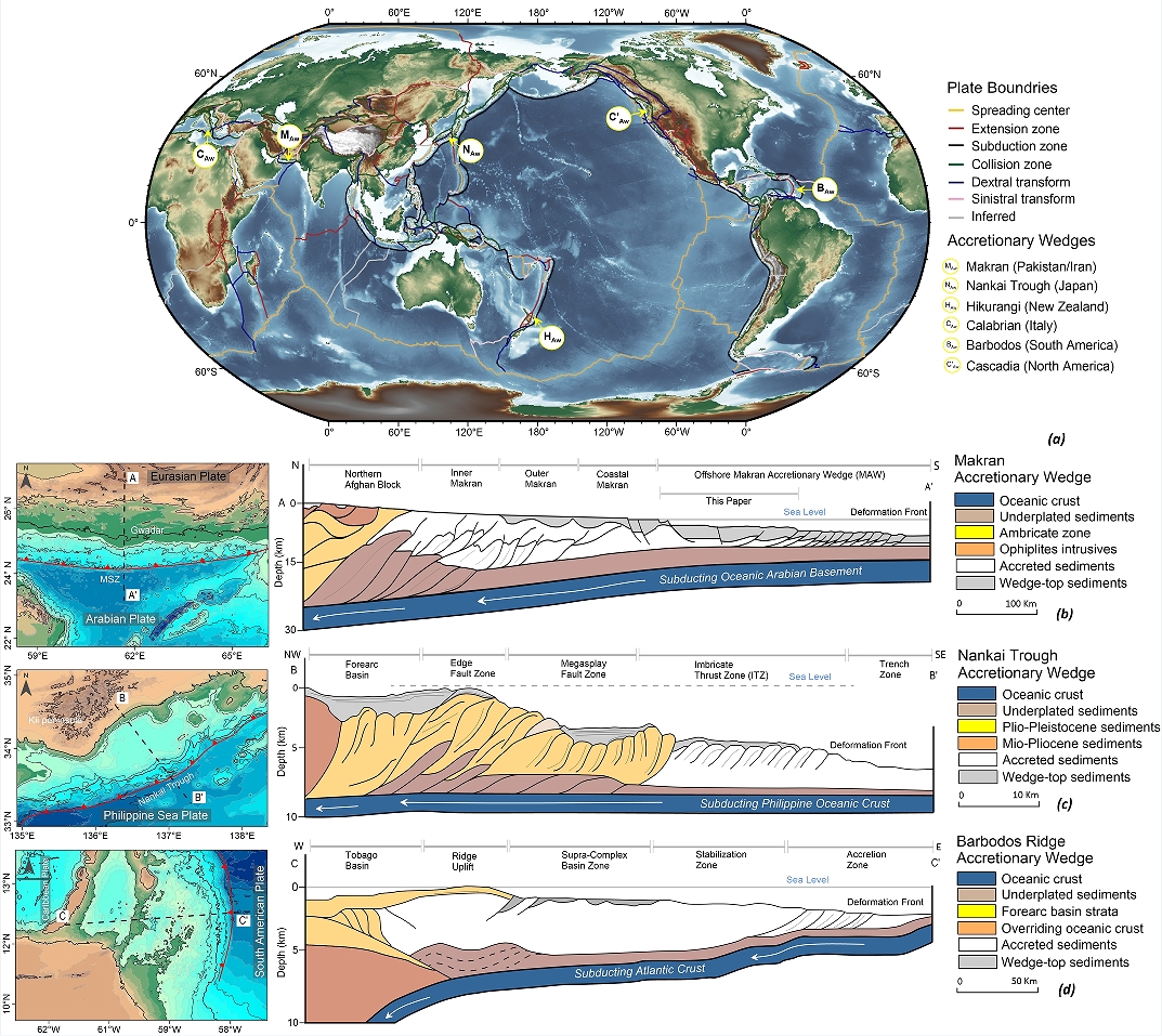 Tectonics plate boundaries, examples of major subduction-driven modern accretionary wedges.