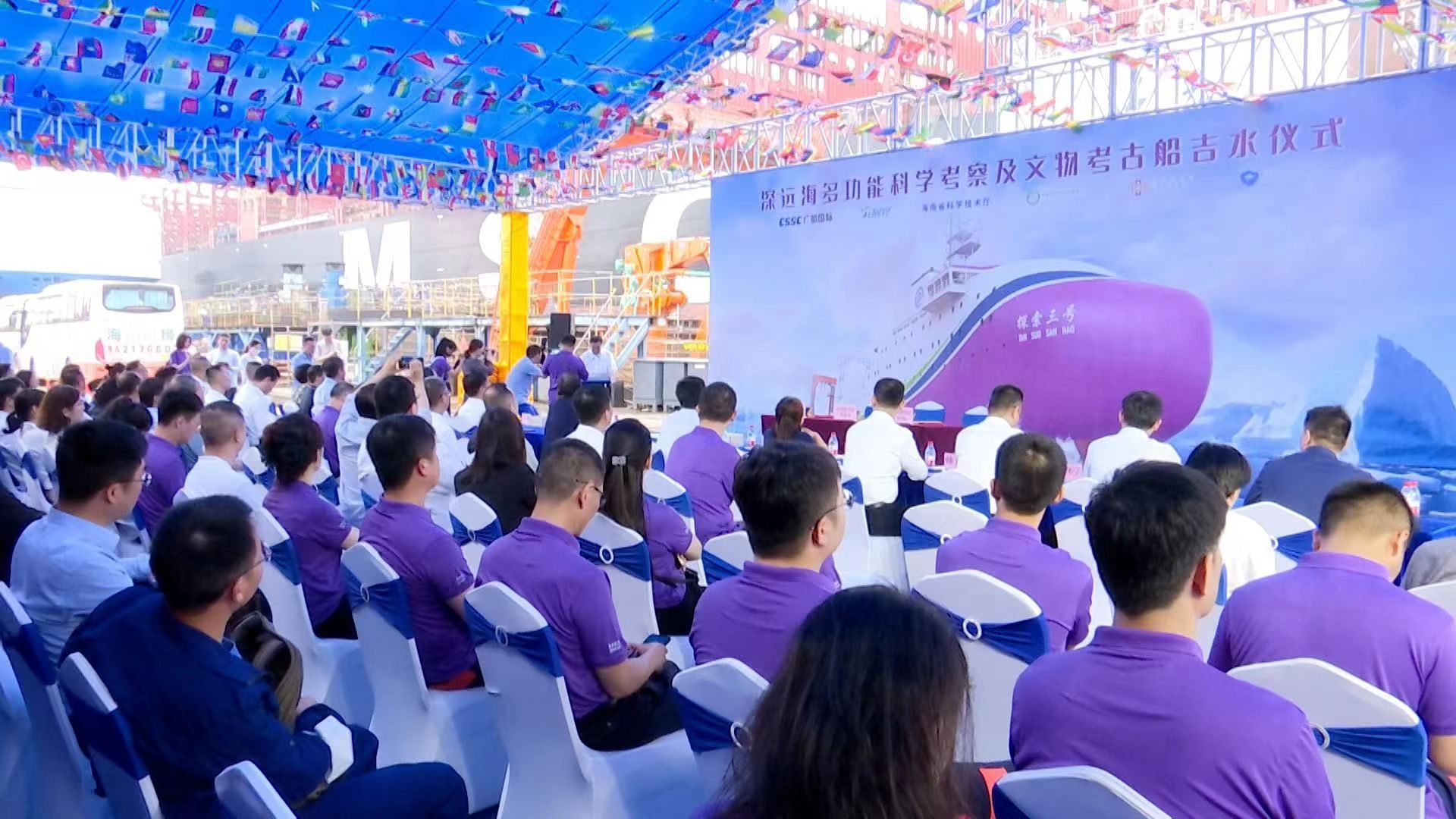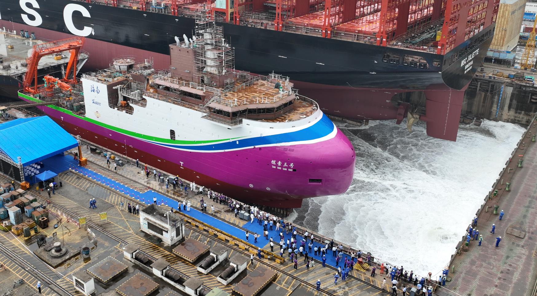 我國(guó)首艘深遠(yuǎn)海多功能科學(xué)考察及文物考古船在中國(guó)船舶廣船國(guó)際出塢