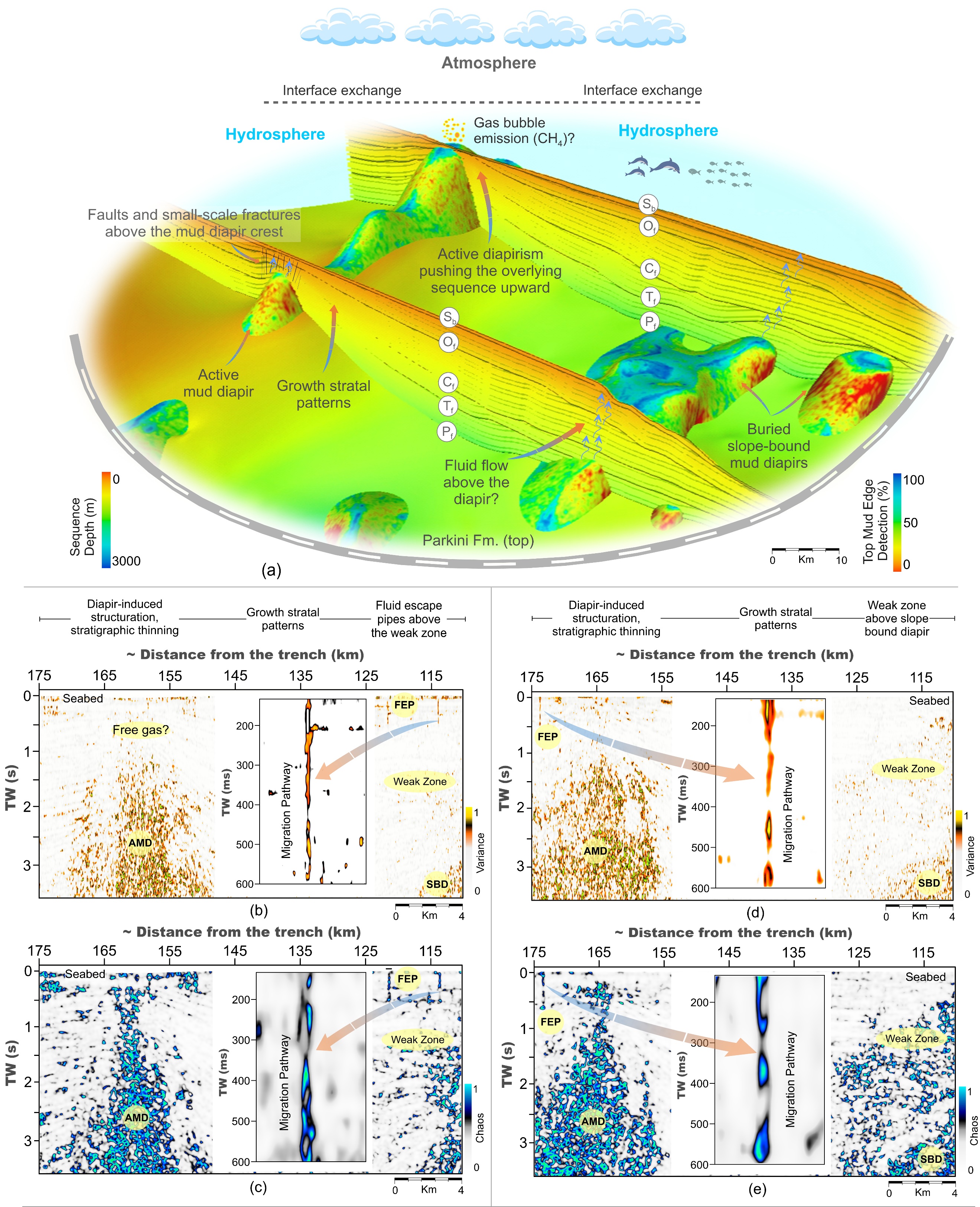 圖3.?Makran Subduction Zone 中泥底辟和流體逃逸管的三維結構及多屬性地震特征