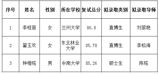 根據教育部、中國科學院大學相關文件精神,本著“公平公正、全面衡量、保證質量、寧缺毋濫”的原則,通過對考生面試、政審以及體檢等綜合考核,經深海所招生工作領導小組審核批準,李桂麗、翟玉歡2位同學根據本人申請并通過考核,被擬錄取為深海所推薦免試直博生、鐘楷銘同學被擬錄取為深海所推薦免試碩士研究生。現將擬錄取名單予以公示,公示期十個工作日。