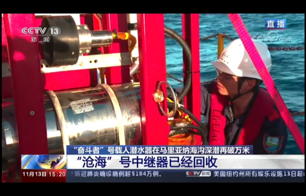 全海深視頻直播系統中的“滄?!碧栆曨l著陸器開展了6次萬米試驗,其中“滄?!碧柵c“奮斗者”號在萬米海底開展了三次聯合作業;全海深視頻直播系統建立了“奮斗者”號載人潛水器→“滄海”號視頻著陸器→“探索二號”船水面控制中心→衛星→中央廣播電視總臺演播室的實時通信鏈路。實現把“奮斗者”號在萬米海底進行科考作業的過程向全國人民進行了世界上首次萬米海底的超高清視頻實況直播和科普教育;通過“滄?!碧柡汀皧^斗者”號載人潛水器上的通信對接,使北京中央廣播電視總臺演播室和萬米海底的潛航員、科學家開展實時視頻對話。海試驗證了項目組研制的全海深超高清相機、超高清3D相機、照明系統、中繼器和“滄?!碧栔懫?、水密接插件等全部國產裝備的可靠性。