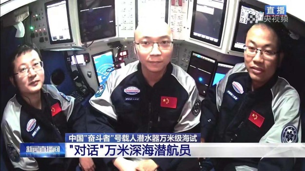 總臺演播室與“奮斗者”號艙內潛航員視頻直播連線