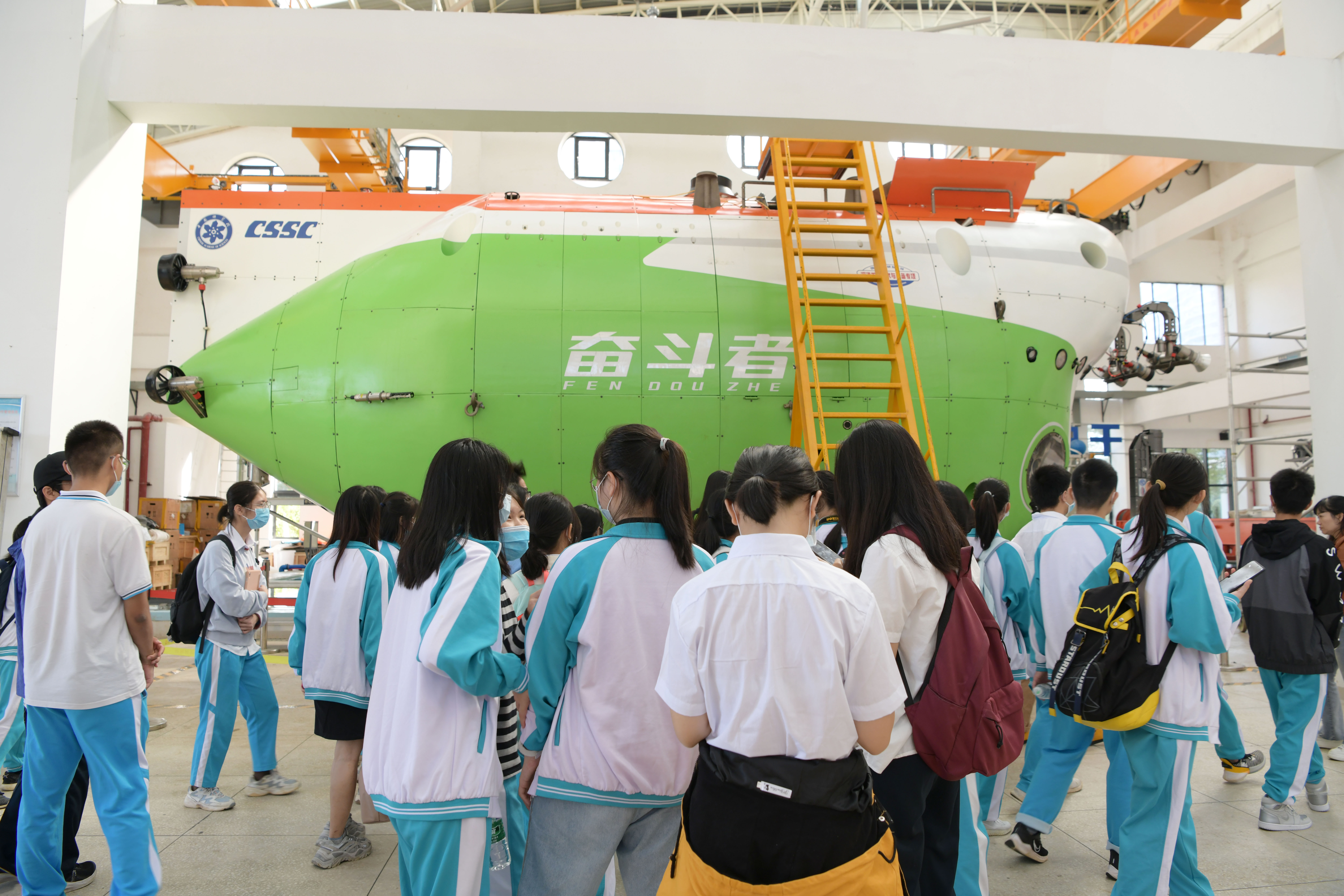 在工程實驗室,同學(xué)們首先在深海所潛航員的引導(dǎo)下,參觀了 “奮斗者”號載人潛水器,仔細聆聽科考故事,了解國之重器;隨后,一一參觀了深淵著陸器、水下機器人和深海采礦機等深海裝備和超高壓模擬實驗裝置。