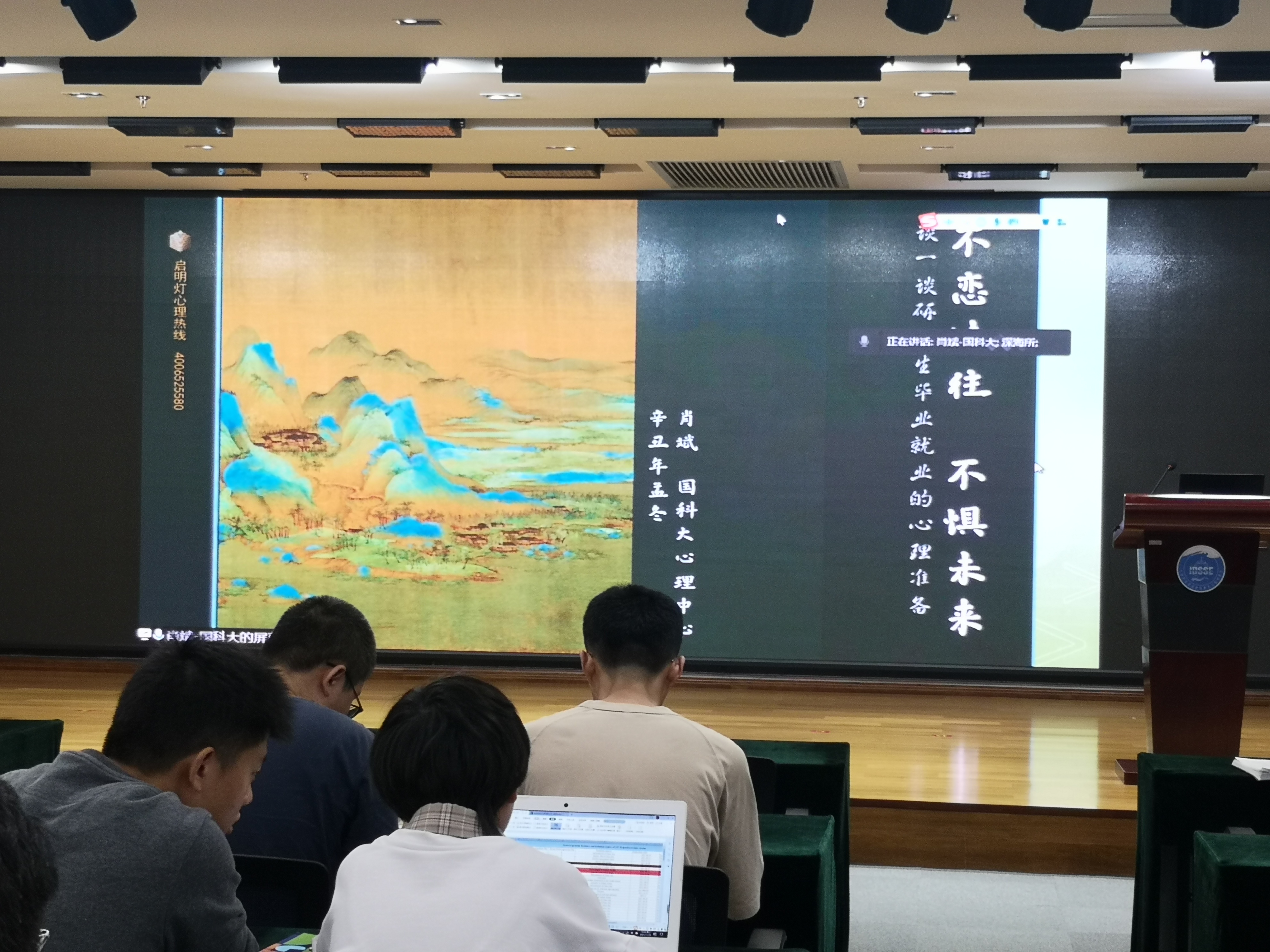 肖斌在講座中為大家分析了研究生畢業(yè)就業(yè)時常見的焦慮原因,例如信息網(wǎng)絡的全覆蓋、學生與社會的脫節(jié)、就業(yè)的艱難選擇、與曾經(jīng)的同學格格不入、理想與現(xiàn)實的落差等,幫助我們從古代詩詞與中華文化中尋求解決之道,包括全方位認識自己、學會換角度看待問題、學會脫離舒適區(qū)、以平常心看待失敗與遺憾等。肖斌的講座是潤物細無聲的引導啟發(fā),為同學們的畢業(yè)就業(yè)做了一次極好的心理建設。
