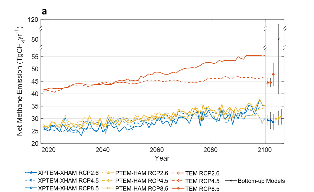 研究人員將最近在北極礦物土壤中發(fā)現(xiàn)的高親和力甲烷氧化菌(HAMs;甲烷氧化細菌)和產(chǎn)甲烷菌的動力學整合到包含永凍層土壤有機碳動力學的生物地球化學模型中。新模型預測,由于永凍層中的有機碳在較暖和的氣候下會更容易被微生物降解,在2017年至2100年之間濕地甲烷排放量將增加一倍。但是,高地凍土由HAMs主導的甲烷匯強度同時也在增加,因而抵消了大部分濕地甲烷的排放,令北極地區(qū)甲烷凈排放量僅增加18%。預計由于HAMs和產(chǎn)甲烷菌對溫度上升所作出的生理反應有異,北極地區(qū)甲烷凈排放量可能會進一步降低。
