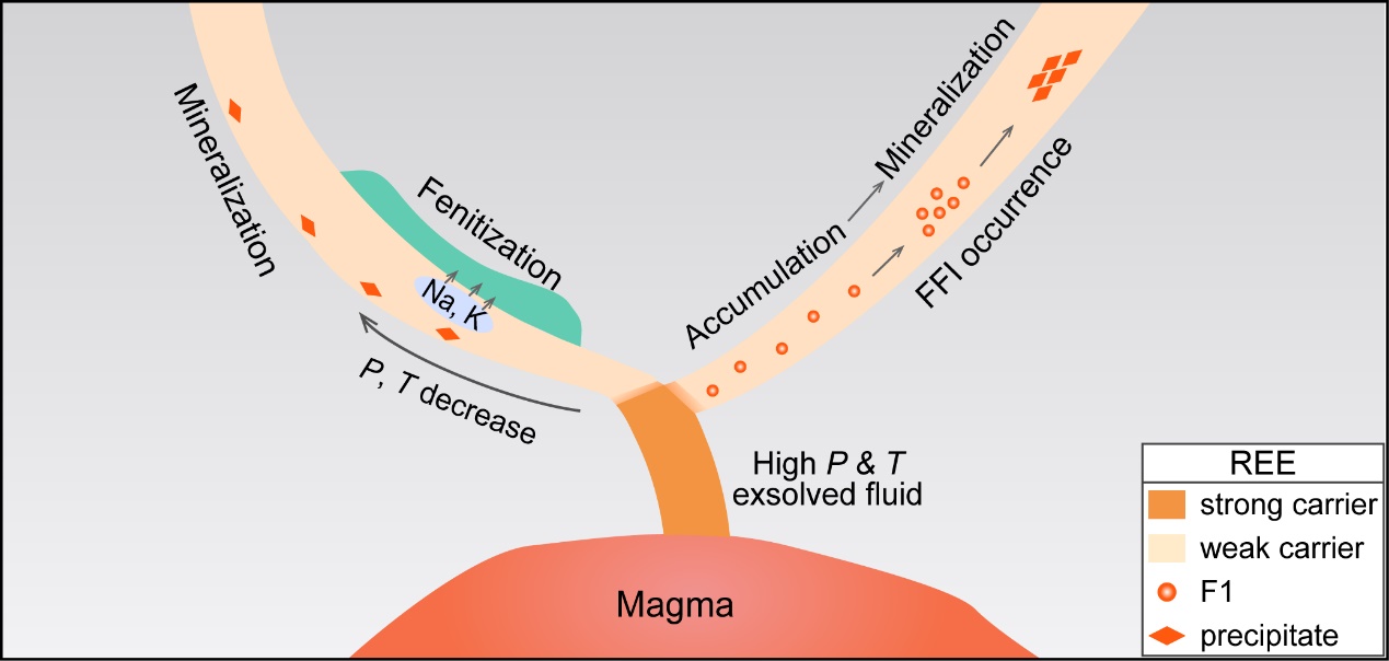 圖2. 硫酸鹽主導(dǎo)的稀土元素遷移、富集、礦化模型(FFI代表液-液不混溶作用,F1指分離出的富集液相)