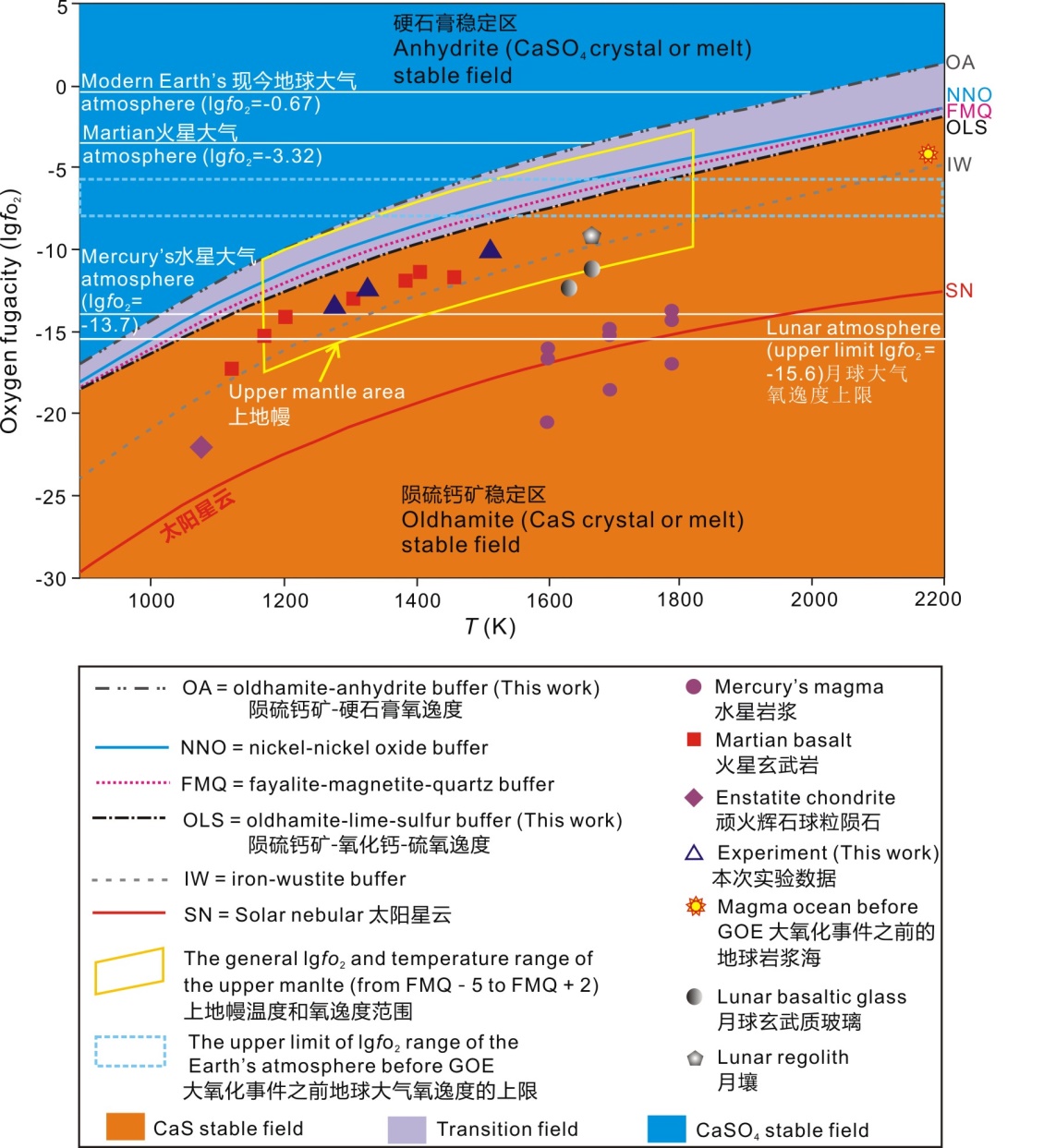 文章定義了2個(gè)氧逸度計(jì):CaS-CaO-S平衡時(shí)的氧逸度(OLS氧逸度計(jì))、CaS-CaSO4平衡時(shí)氧逸度(OA氧逸度計(jì))。在0.5 GPa/1320 K, OA = FMQ + 2.21= IW + 6.05 (lgfo2 = –7.83), OLS = FMQ – 0.52 = IW + 3.30 (lgfo2 = –10.57),其本質(zhì)上確定了S2-/S0平衡時(shí)和S2-/S6+平衡時(shí)的氧逸度,為行星硫循環(huán)和礦床學(xué)研究提供了重要的便利。巖漿低氧逸度、大氣極低氧含量、無(wú)大量液態(tài)水是CaS可在水星、月球表面較廣泛存在的3個(gè)條件,否則CaSO4將大量存在,如地球上和火星上表面大量的硫酸鈣或石膏。