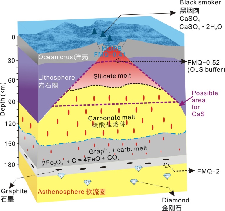 文章首次指出隕硫鈣石可能在洋中脊下覆地幔存在,其可能是黑煙囪部分硫酸鈣的前體(圖3),該機(jī)制是對(duì)Bischoff and Seyfried (1978)認(rèn)為洋中脊硫酸鹽是由于Ca和SO42-在海水中的溶解度隨著溫度的升高而降低機(jī)制的補(bǔ)充。