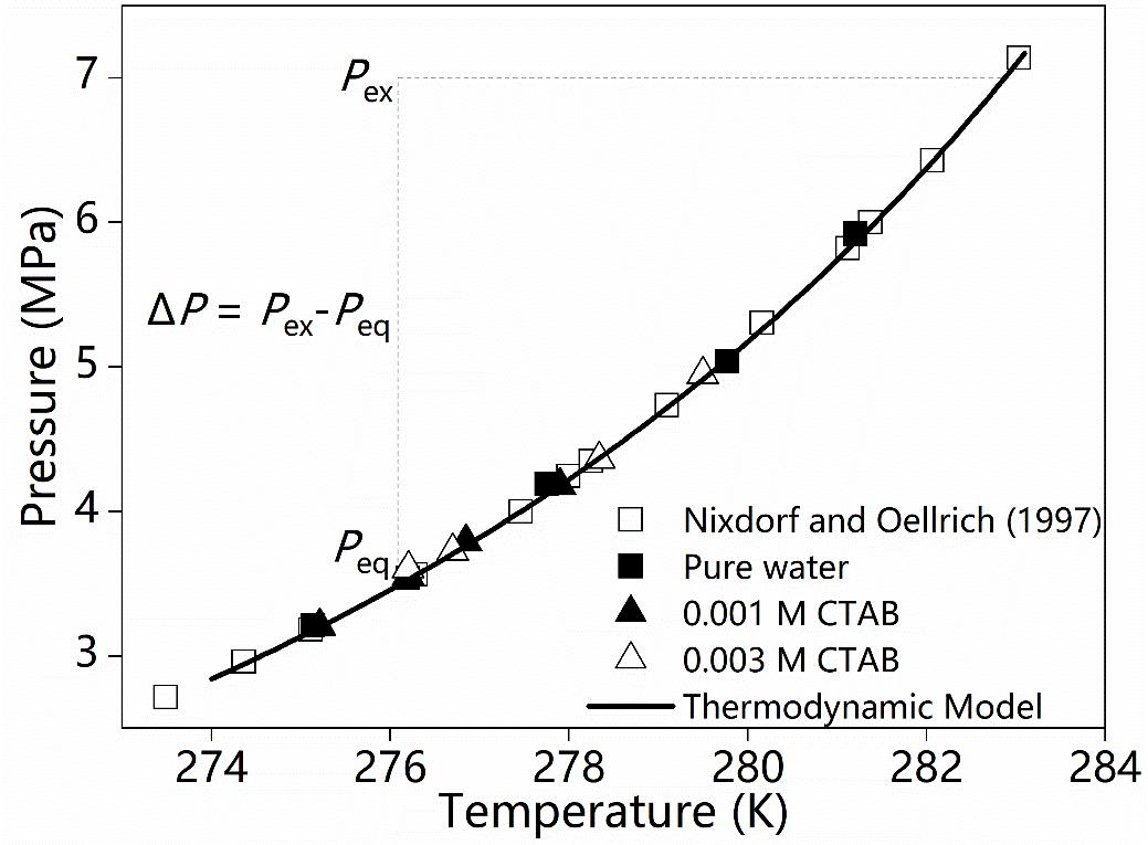 近期,深海極端環境模擬研究室應用大體積藍寶石反應釜與熔融毛細硅管實驗平臺,結合拉曼光譜手段開展了甲烷水合物的熱力學及動力學研究。研究發現,表面活性劑(CTAB)不會改變甲烷水合物的相平衡條件(圖1)。在微觀尺度(毛細硅管),CTAB對甲烷水合物的生長速率無明顯影響;而宏觀尺度(藍寶石反應釜)的實驗過程表現出了不同的特征。水合物形成初期,其生長過程與微觀實驗過程相似,CTAB無明顯影響;隨著大量水合物的形成,氣體傳質受阻,CTAB會明顯提升水合物的生長速率。對比實驗的結果揭示了表面活性劑的作用機理,即通過降低表面張力,增大氣液固接觸面積,從而提高水合物的生長速率。
