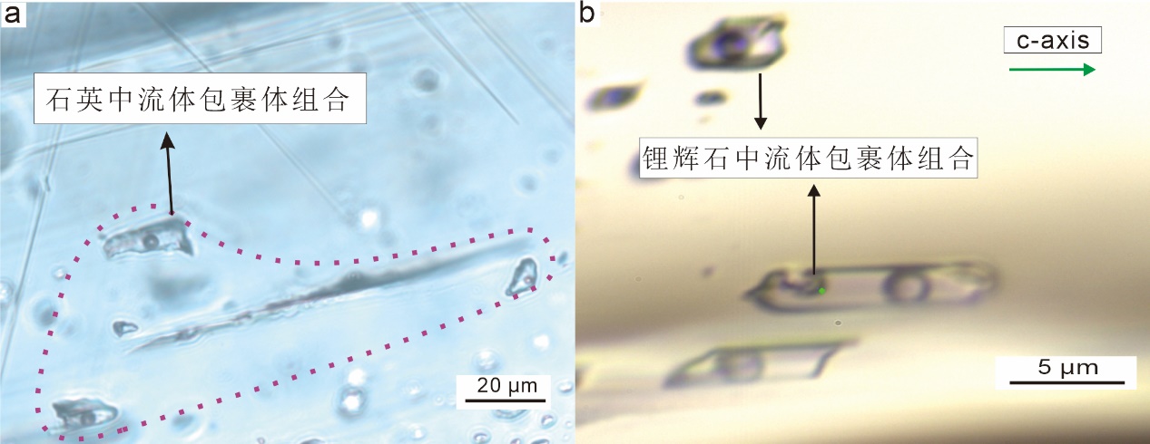 1. 李家溝成礦偉晶巖中的流體包裹體顯微鏡下特征。a)石英的富液相流體包裹體組合,沿次生裂隙分布;b)鋰輝石中的富液相流體包裹體組合,沿鋰輝石晶體C軸分布。