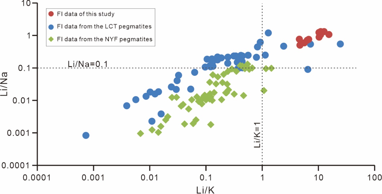 2. 此次研究獲得的流體包裹體(FI)中的Li/NaLi/K的比值, 以及前人報(bào)道的鋰--鉭(LCT)和鈮--氟(NYF)偉晶巖體系的研究結(jié)果。