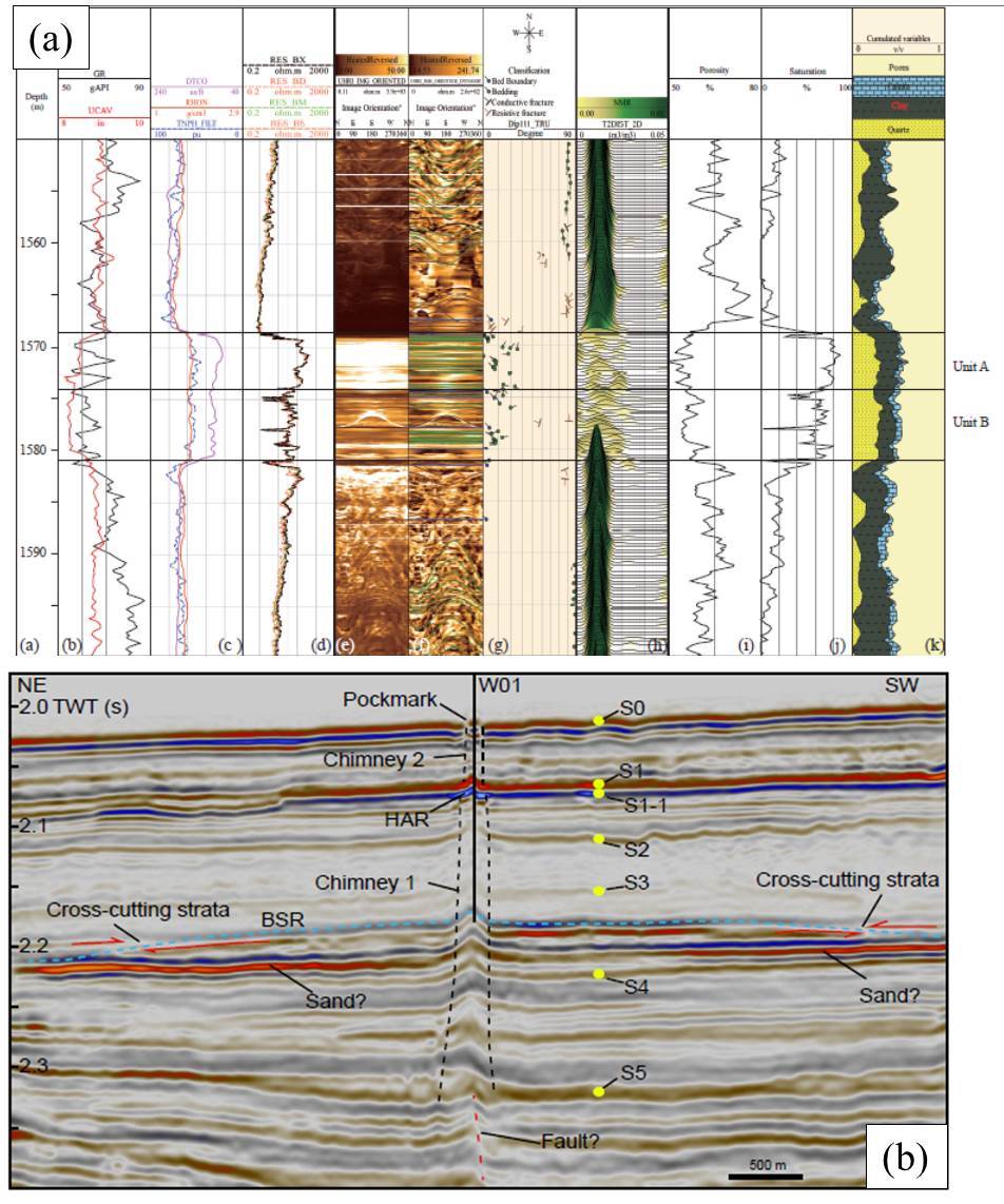 圖1. (a)W01站位測井數據。 圖中方框(Unit A和B)為富含水合物的砂層,砂層上下泥巖層中發育高角度裂隙,砂層中未發現垂向裂隙。(b)過W01地震剖面。 S1和S1-1分別為砂層的頂界面和底界面,砂層上下分別發育兩個氣煙囪。