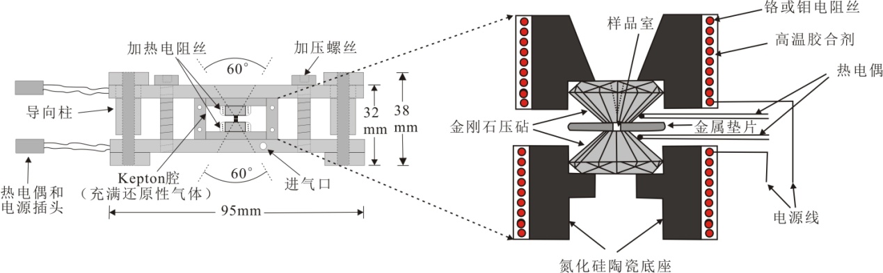 最新式HDAC(type V)的結(jié)構(gòu)組成主要包括不銹鋼腔體、陶瓷底座、加熱電阻絲、熱電偶、金屬墊片以及上下兩顆金剛石對頂砧等(圖1)。實驗時,樣品存放在金屬墊片的孔洞內(nèi),上下兩顆金剛石壓合在金屬墊片上,它們共同組成一個封閉的樣品腔,通過旋轉(zhuǎn)螺絲施壓,使樣品腔封閉。上下兩顆金剛石底座的周邊纏繞電阻絲,金剛石側(cè)壁粘貼熱電偶,達到加熱和測量溫度的效果。實驗一般采用純H2O作為壓力介質(zhì),不銹鋼片、錸片、銥片等作為HDAC的金屬墊片。