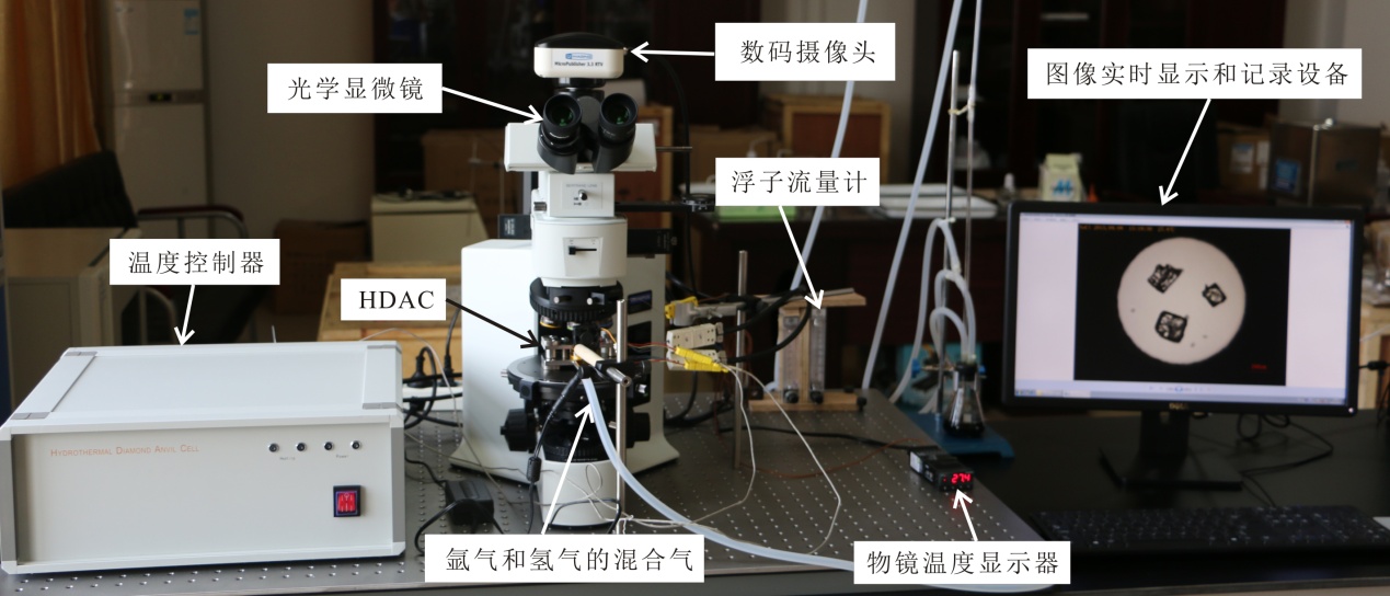 深海極端環(huán)境模擬研究實驗室現(xiàn)已完成整套熱液金剛石壓腔高溫高壓實驗平臺的搭建工作。熱液金剛石壓腔高溫高壓實驗平臺主要由HDAC、溫度控制器、光學顯微鏡、數(shù)碼攝像頭、圖像實時顯示和記錄設備以及用于保護金剛石對頂砧在高溫時不被氧化的混合氣體(氬氣和氫氣)的導入和排放系統(tǒng)等組成(圖2)。目前,已完成熱液金剛石壓腔實驗平臺的溫度校準工作,該實驗平臺已達到投入科學研究的要求。