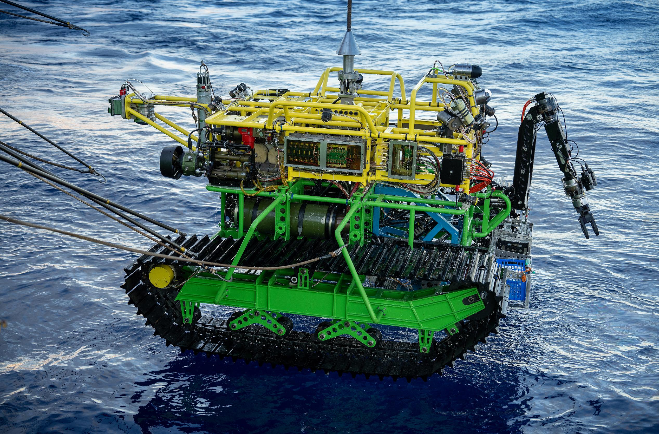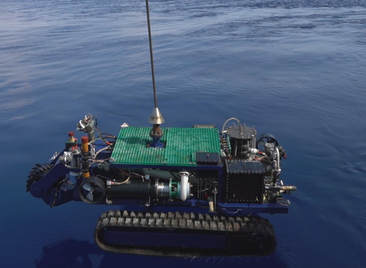 深海富鈷結殼規(guī)模采樣車設計深度4500m,裝置長4.3m,寬2.3m,高1.6m,空氣中重量4.1噸,水中重量3.0噸,裝機容量80kW,每小時完成500kg富鈷結殼礦物的剝離、破碎和收集。該裝置于2018年4月在南海海域2500m水深開展了海上試驗,并獲取富鈷結殼礦石樣品,驗證了深海富鈷結殼采樣裝置的作業(yè)功能,包括布放回收時自動定向功能、海底行走功能、海底礦石破碎收集功能力,在極端復雜海底地形中具備作業(yè)能力。